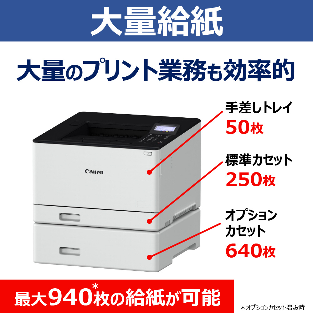 給紙容量 (標準)カセット:250枚×1段、手差しトレイ:50枚(オプション)640枚×1段(最大)940枚