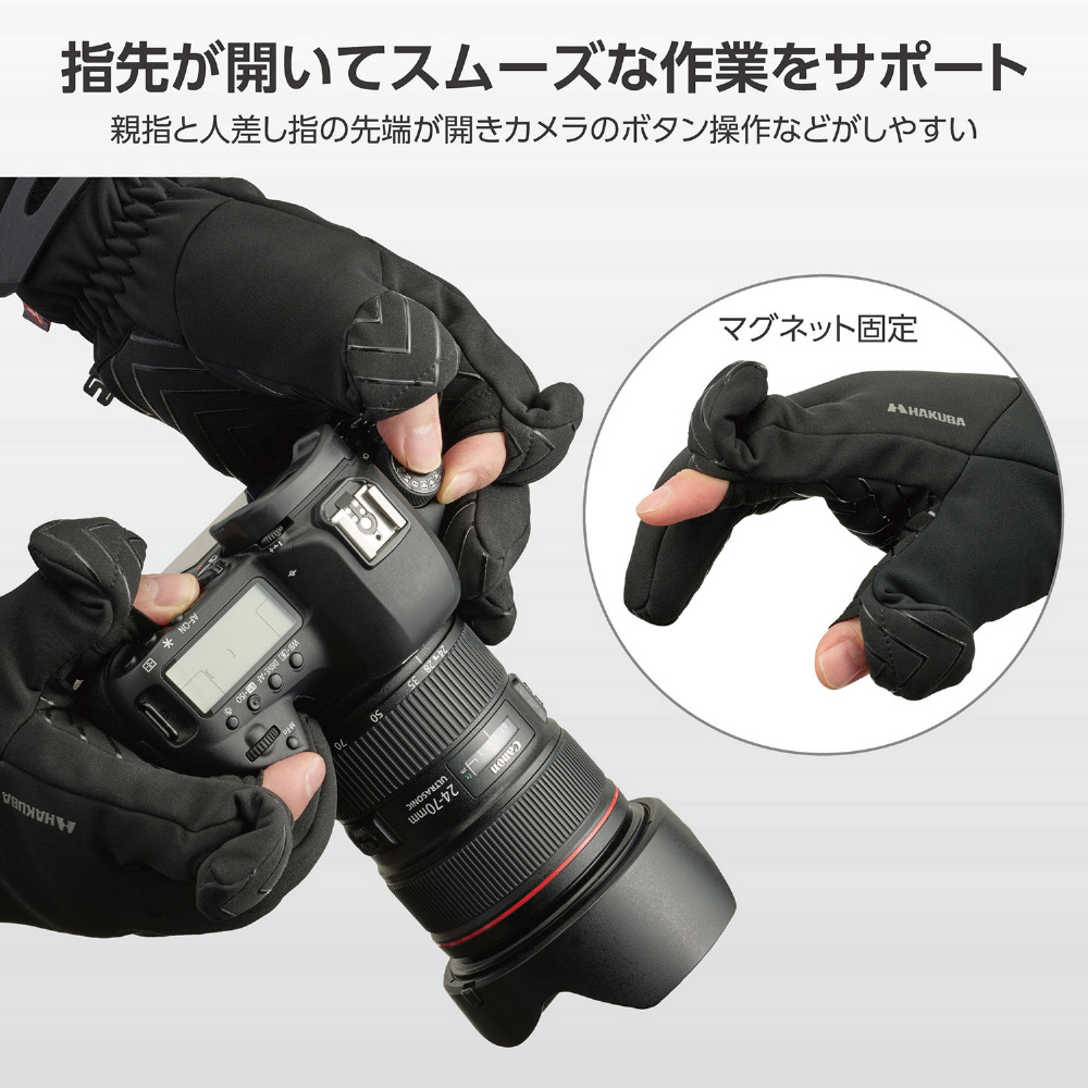 手のひら全体に施した滑り止めプリントで大切な機材をしっかりホールドします。人差し指と親指の先端は指を出せる構造で、細かな作業も快適。開閉部はマグネット式なので、衣服や肌を傷つける心配がありません。