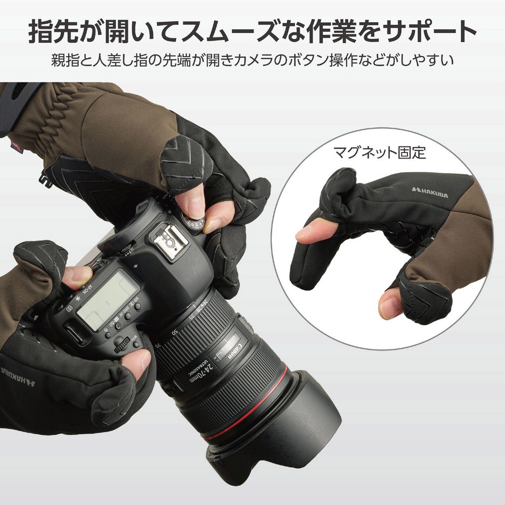 手のひら全体に施した滑り止めプリントで大切な機材をしっかりホールドします。人差し指と親指の先端は指を出せる構造で、細かな作業も快適。開閉部はマグネット式なので、衣服や肌を傷つける心配がありません。