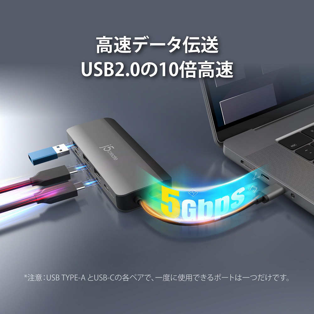 最大5Gbpsの高速転送に対応し、外部ストレージやマウス・キーボードなど複数のUSB機器を快適に接続可能。Type-AとType-Cはペアごとに排他使用。