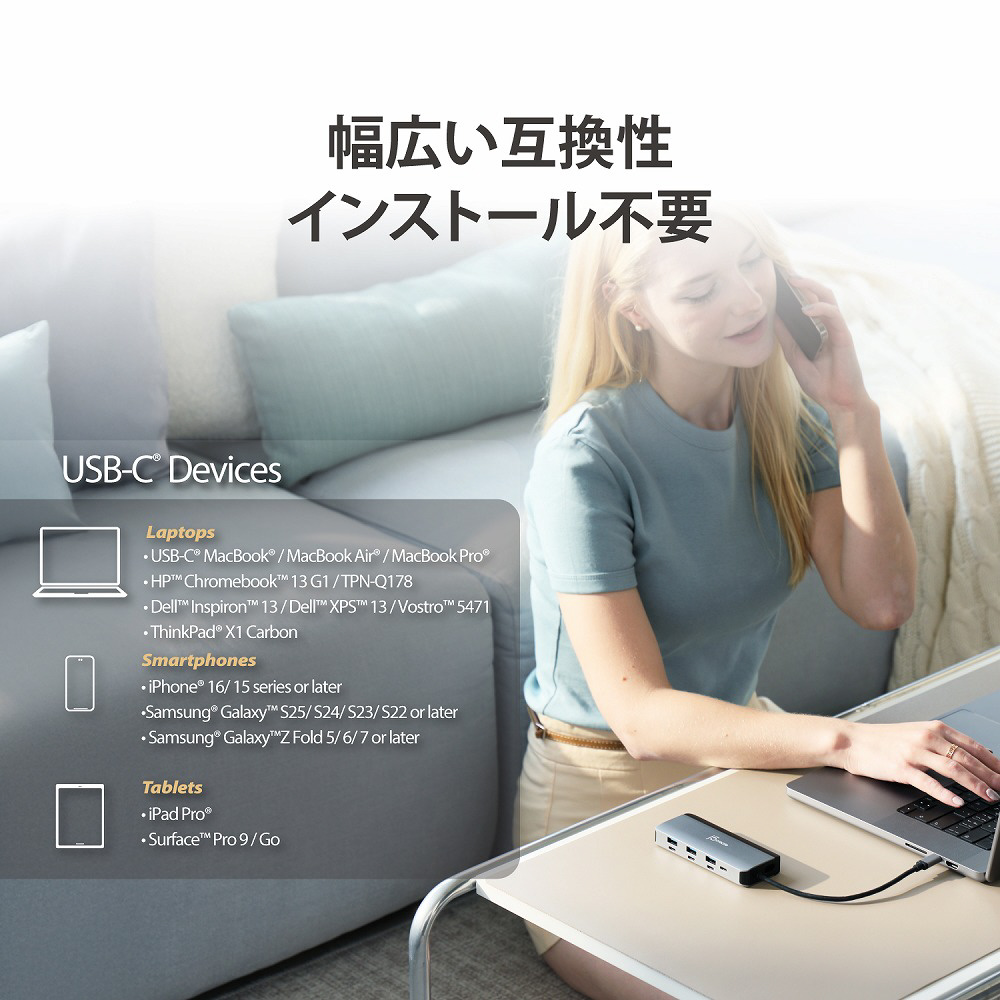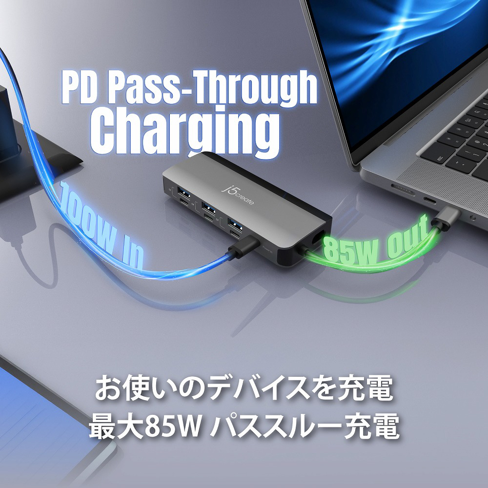 最大85Wの高速充電に対応し、ノートPCやタブレットを充電しながら周辺機器も同時に使用可能。電力供給と作業効率を両立。
