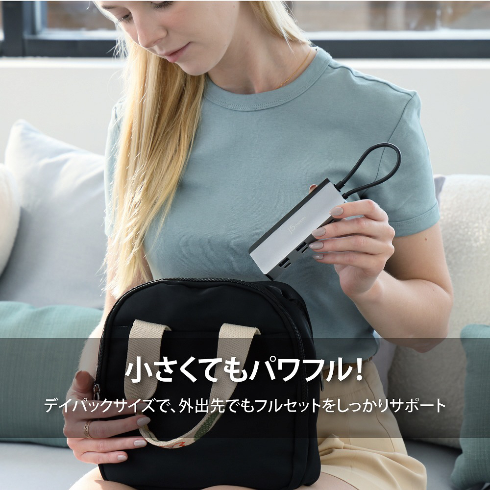ケーブル収納式のスリム設計で、持ち運びにも最適。DisplayPort Alt Mode対応機器に接続するだけで、映像出力・データ転送・充電を一括で実現します。