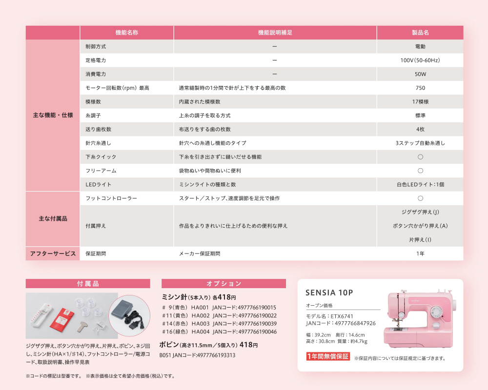 付属品 ジグザグ押え、ボタン穴かがり押え、片押え、ボビン、ネジ回し、ミシン針、フットコントローラー/電源コード、取扱説明書、操作早見表