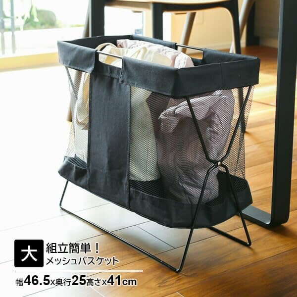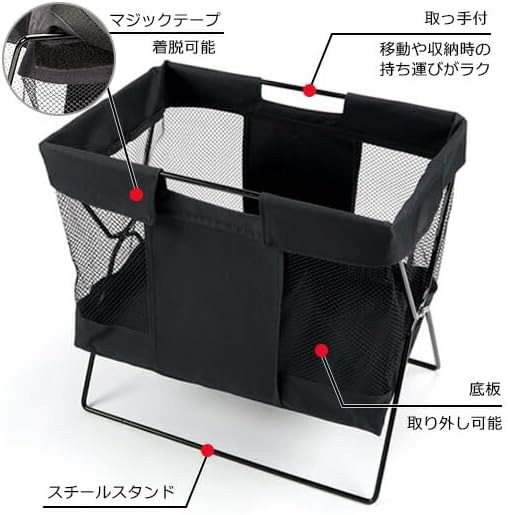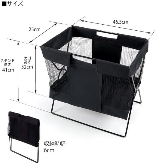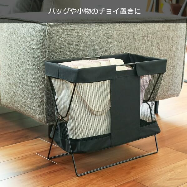 バッグや小物のちょい置きに便利。カフェやホテルにピッタリの荷物置き。手荷物やバッグを床置きしないメッシュバスケット。荷物の収納はもちろん、マガジンラックとしても使用できます。ブラック基調なのでスタイリッシュな空間を演出します。ホテルや飲食店はもちろん、ご家庭でのちょっとした小物収納にも便利。使わないときは、折りたたんでスリムに収納できます。持ち手付きだから移動や折りたたみ収納の際に便利。