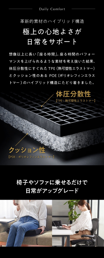 想像以上に長い「座る時間」。 座る時間のパフォーマンスを上げられるような素材を考え抜いた結果、体圧分散性にすぐれた TPE (熱可塑性エラストマー) とクッション性のある POE(ポリオレフィンエラス トマー)のハイブリッド構造にたどり着きました。