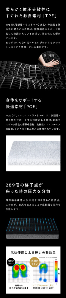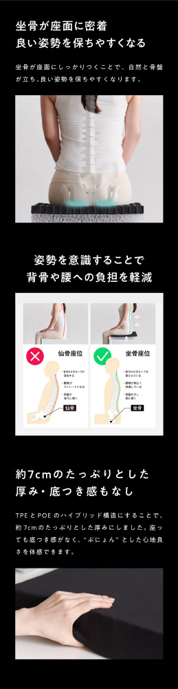 TPEとPOEのハイブリッド構造にすることで、約7cmのたっぷりとした厚みにしました。座っても底つき感がなく、”ぷにょん”とした心地良さを体感できます。