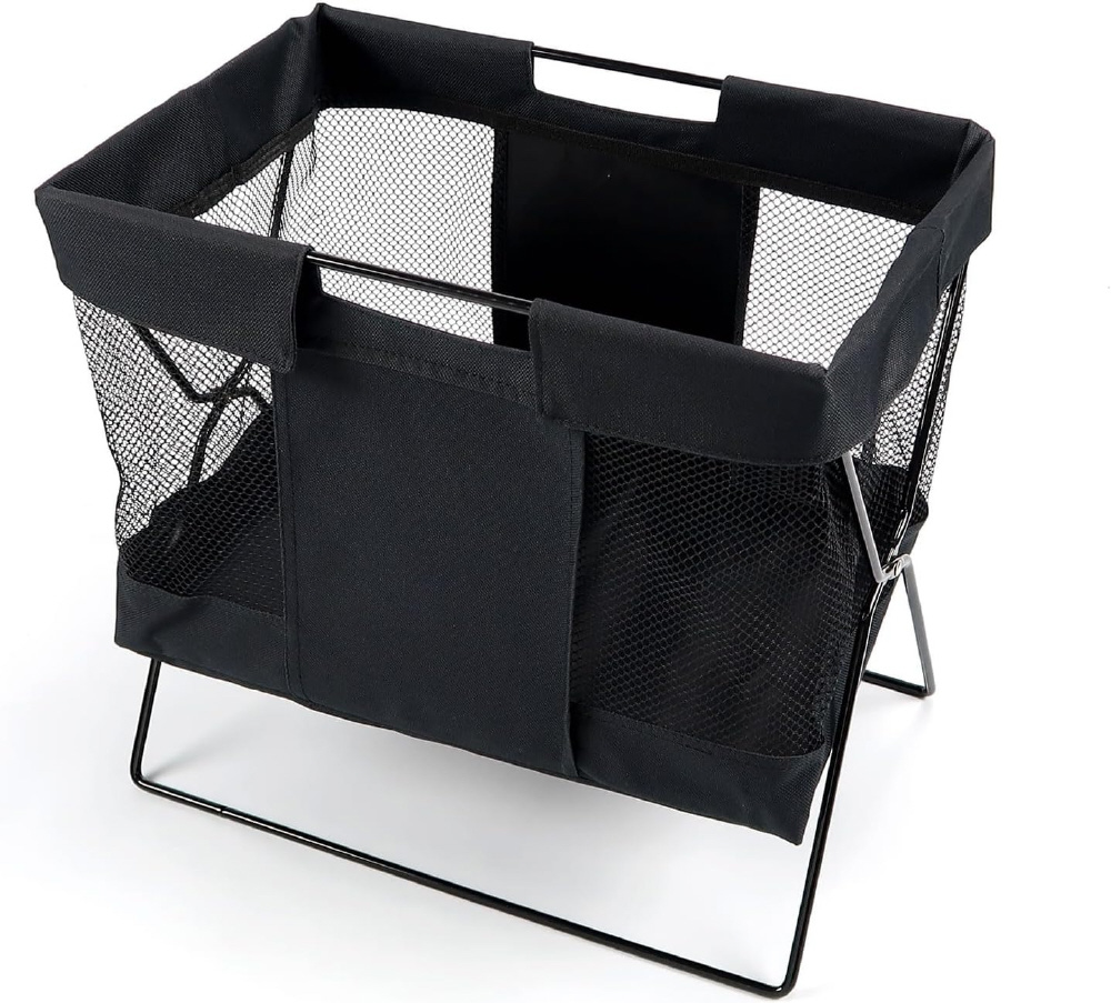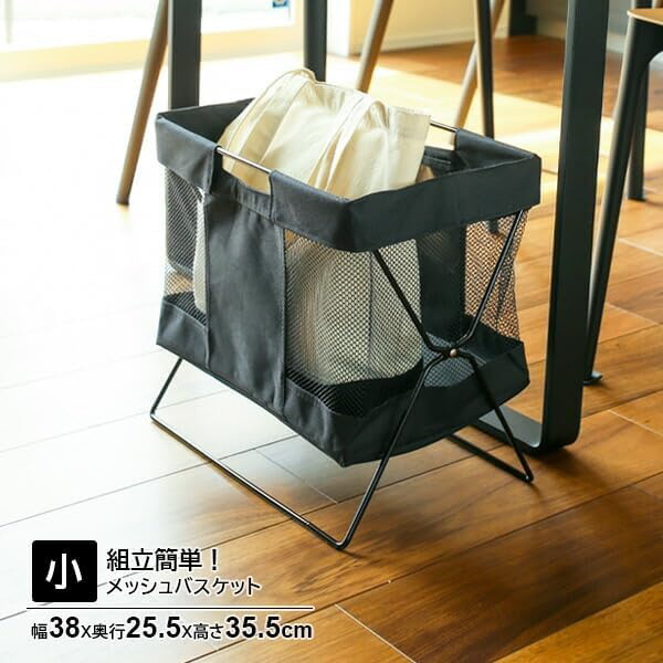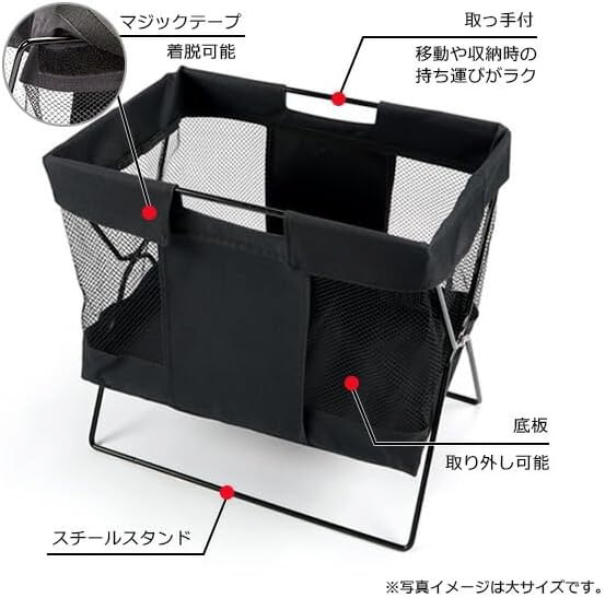 カフェやホテルにピッタリの荷物置き。手荷物やバッグを床置きしないメッシュバスケット。荷物の収納はもちろん、マガジンラックとしても使用できます。ブラック基調なのでスタイリッシュな空間を演出します。ホテルや飲食店はもちろん、ご家庭でのちょっとした小物収納にも便利。使わないときは、折りたたんでスリムに収納できます。持ち手付きだから移動や折りたたみ収納の際に便利。