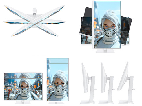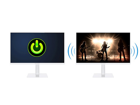 ■本体カラーにホワイトを採用。モニターベゼルやスタンドも白となっており、爽やかでおしゃれな空間を演出したい場合や、デバイスを白で統一したい場合に最適です。さらに、付属のケーブルや電源アダプターにもホワイトカラーを採用。全体が白基調に統一された部屋や医療機関などでの使用にも最適です。