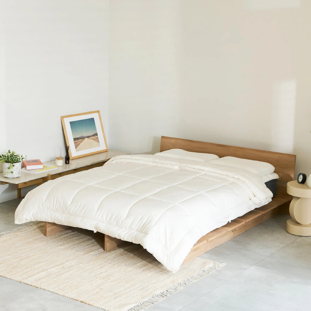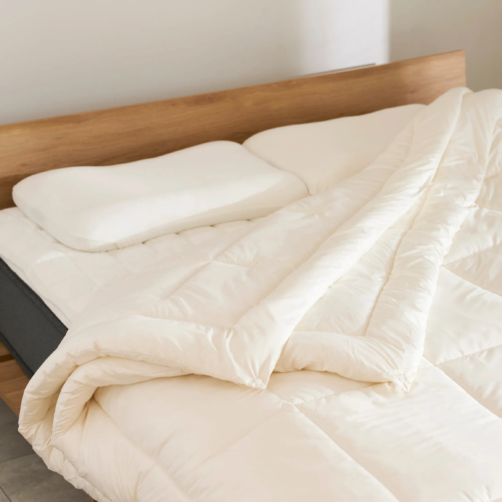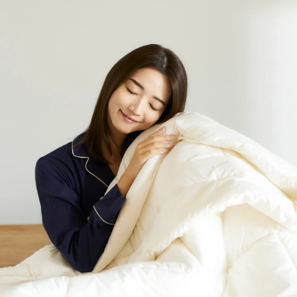羽毛のような心地よさと、お手入れしたい時に自宅の洗濯機で洗える手軽さ、どちらも実現したこだわりの贅沢なかけ布団。2枚合わせ仕様で、オールシーズンお使いいただけます。