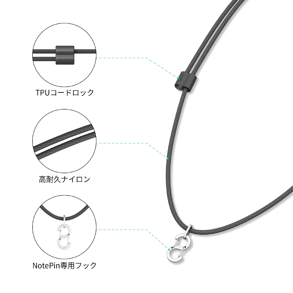 NotePinをフックで簡単かつ強固に取り付けて首にかけることができる、専用デザインのネックストラップです。高耐久ナイロン+TPUコードロック、いずれも耐摩耗性に優れ、長時間の使用でも快適な着け心地を実現します。ダブルアジャスターで長さを簡単に調整でき、首元にぴったりフィット。移動中や作業中でもNotePinを首に掛けておけば、いつでもすぐに録音でき、紛失の心配も軽減します。