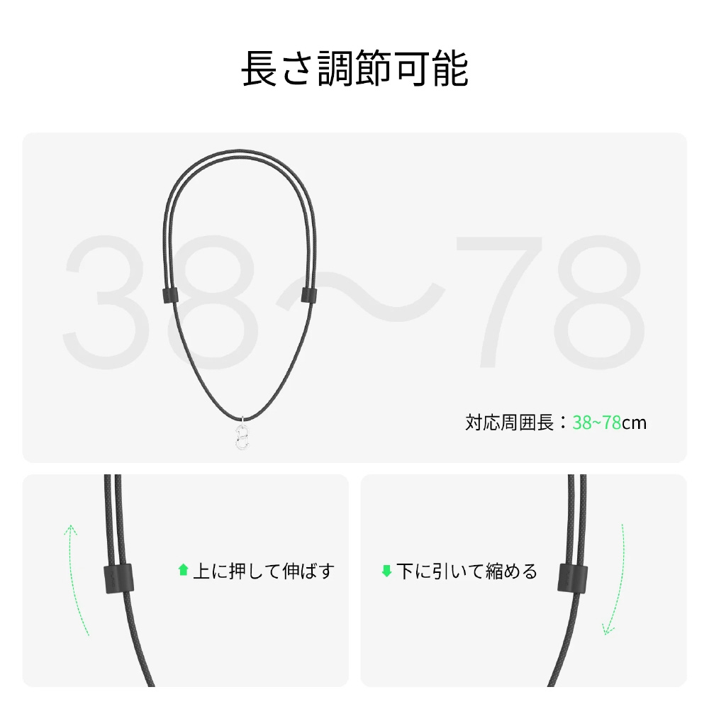 ■長さ調整可能:ダブルアジャスターで、首元に合わせて約38〜78cmの範囲で簡単に幅広い長さ調整が可能。