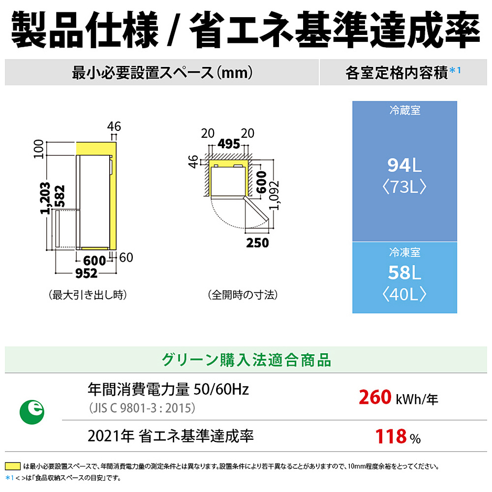 ※5 トップテーブルの上に物をのせる場合は、冷蔵庫の後ろ側(背面側)にはみ出さないようにしてください。また、必要設置スペースは、のせたものの最上部から100mm以上となります。電子レンジ等をのせる場合は、必要な放熱スペース(電子レンジ等のカタログ・取扱説明書記載)をご確認の上お使いください。トップテーブルの耐荷重は30kgです。電子レンジ・オーブンレンジのタイプ、サイズによっては置けない場合があります。