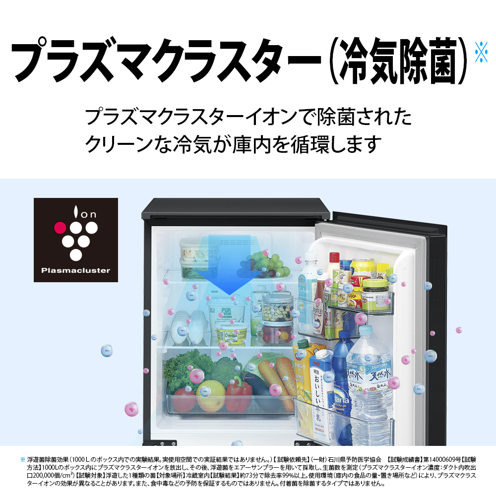 ※1 浮遊菌除菌効果(1000Lのボックス内での実験結果。実使用空間での実証結果ではありません。)【試験依頼先】(一財)石川県予防医学協会【試験成績書】第14000609号【試験方法】1000Lのボックス内にプラズマクラスターイオンを放出し、その後、浮遊菌をエアーサンプラーを用いて採取し、生菌数を測定(プラズマクラスターイオン濃度:ダクト内200000個/cm3)【試験対象】浮遊した1種類の菌【対象場所】冷蔵室内【試験結果】約73分で除去率99%以上。