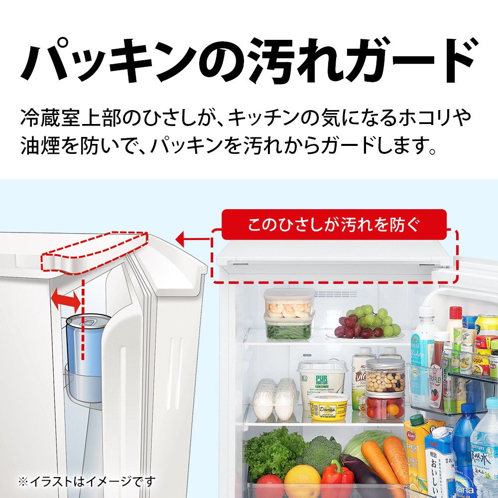 冷蔵室上部のひさしが、キッチンの気になるホコリや油煙を防いで、パッキンを汚れからガードします。