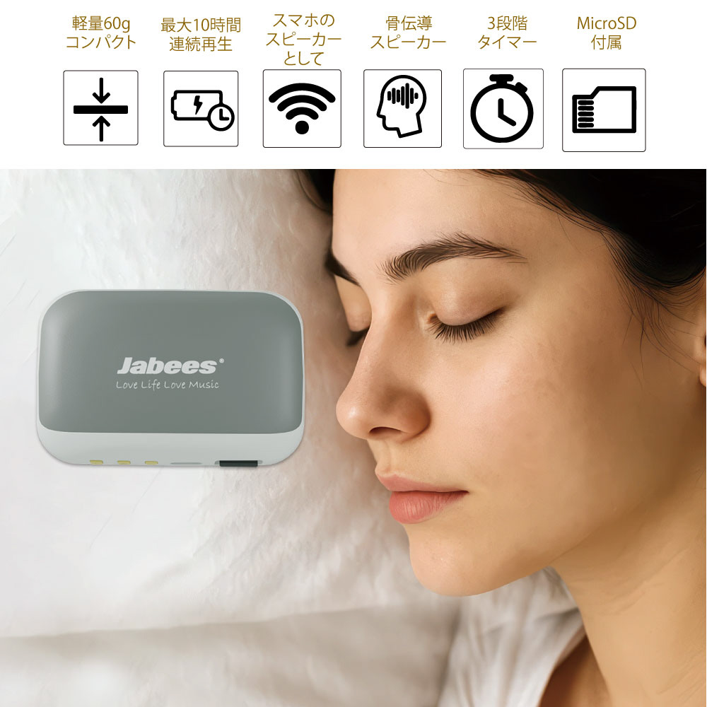 イヤホンや通常のスピーカーではなく、軽量・薄型の骨伝導スタイルの枕元スピーカーです。 周波振動で音を伝達し骨伝導を主体に伝えるため耳(鼓膜)が疲れにくく、自然に音をとらえられるため入眠のサポート、 ごろ寝スピーカーとして最適です。