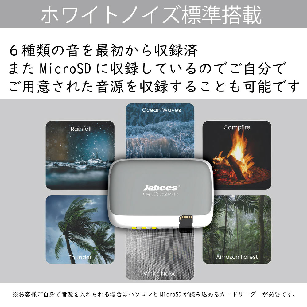 本製品に収録しているホワイトノイズは、これらの邪魔な音を自然にカバーし、一晩中安定した音環境を提供いたします。