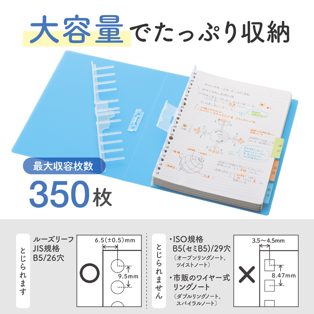 B5サイズ/26穴(JIS規格)のルーズリーフを保管できます。