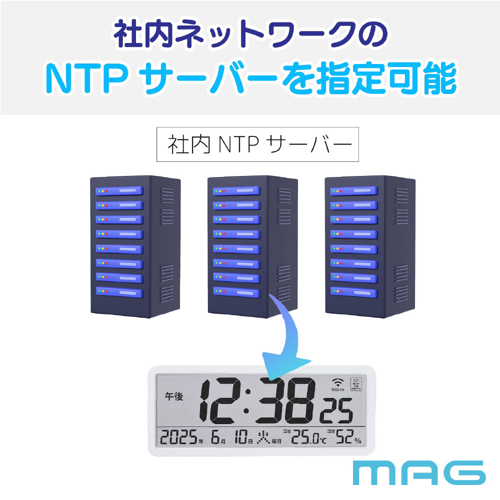・本製品は施設内の一つのネットワーク時刻情報(NTP)に同期するため、例えば各部屋に設置した時計それぞれに時間の個体差が発生しません。