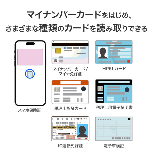 ※動作確認済みカード:マイナンバーカード(マイナ保険証・マイナ免許証)、HPKIカード(医師資格証・薬剤師資格証)、税理士用電子証明書、IC運転免許証、e-Passport、電子車検証