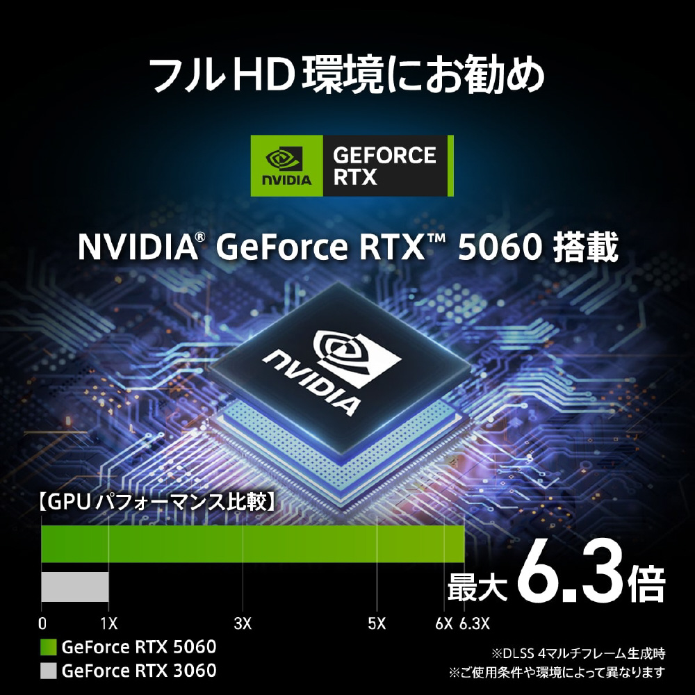 NVIDIA GeForce RTX 5060を搭載し、最新のDLSS 4対応ゲームで高いパフォーマンスを発揮します