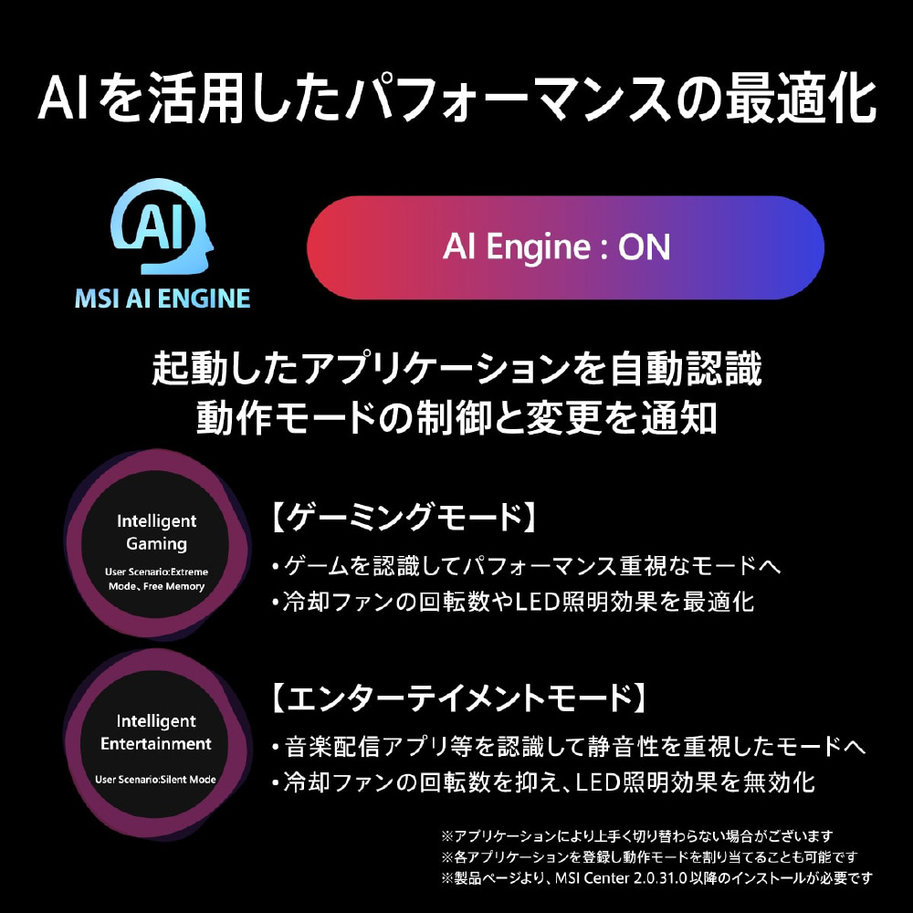 AIを用いた動作モードと冷却ファンの制御システムを備え、使用アプリに応じて適切なパフォーマンス制御が可能です。