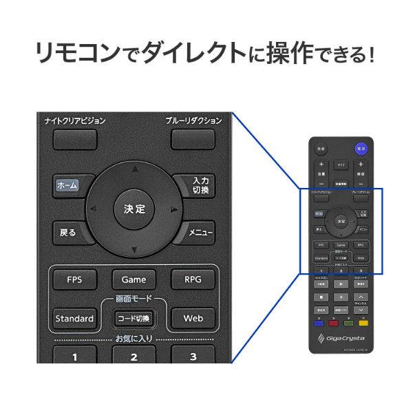 入力切換や音量の調節などをはじめ、ゲームのジャンルにあわせたモードの選択や各種機能のON/OFFなども簡単に設定できます。