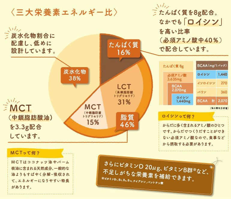 無理なく飲みきれる100mlで200kcalの少量・高カロリー栄養補助食品の飲み残しあり、と回答した施設※ における本品採用後の喫食状況変化。84%が完食、または飲み残しが減りました。●たんぱく質にこだわっています。たんぱく質を8g配合。なかでも「ロイシン」を高い比率(必須アミノ酸中40%)で配合しています。ロイシンって何? からだに多く含まれるアミノ酸のひとつです。からだでつくりだすことができない必須アミノ酸なので、食事などから摂取する必要があります。●脂質にこだわっています。MCT(中鎖脂肪酸油)を3.3g配合しています。M C Tって何? M C Tはココナッツ油やパーム核油に含まれる天然成分。一般的な油よりもすばやく分解・吸収されて、エネルギーになりやすい特長があります。ビタミンにこだわっています・ビタミンD20μg、ビタミンB群※など、不足しがちな栄養素を補給できます。※ビタミンB1、B2、B6、B16、ナイアシン、パントテン酸