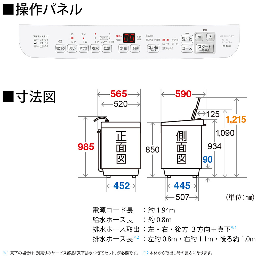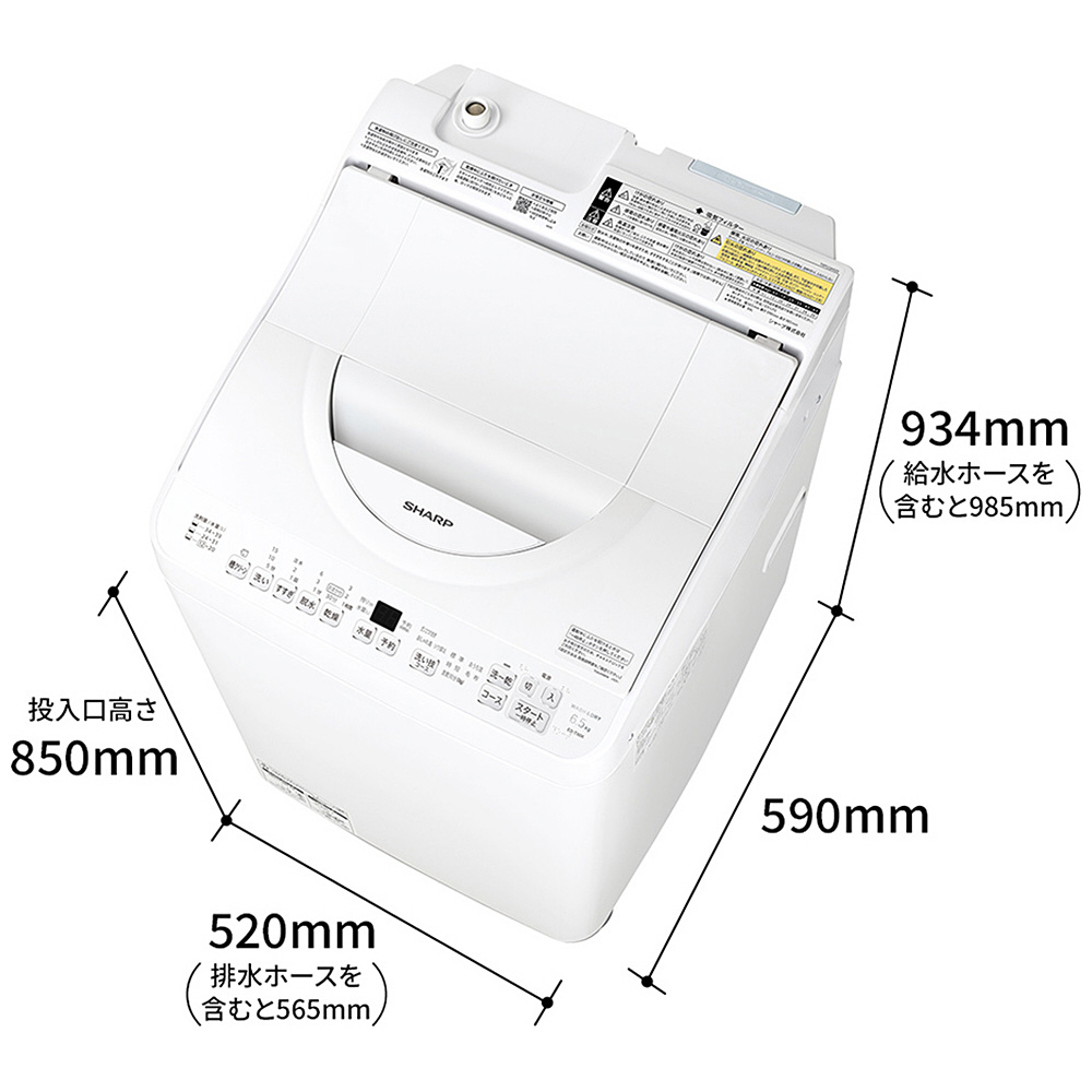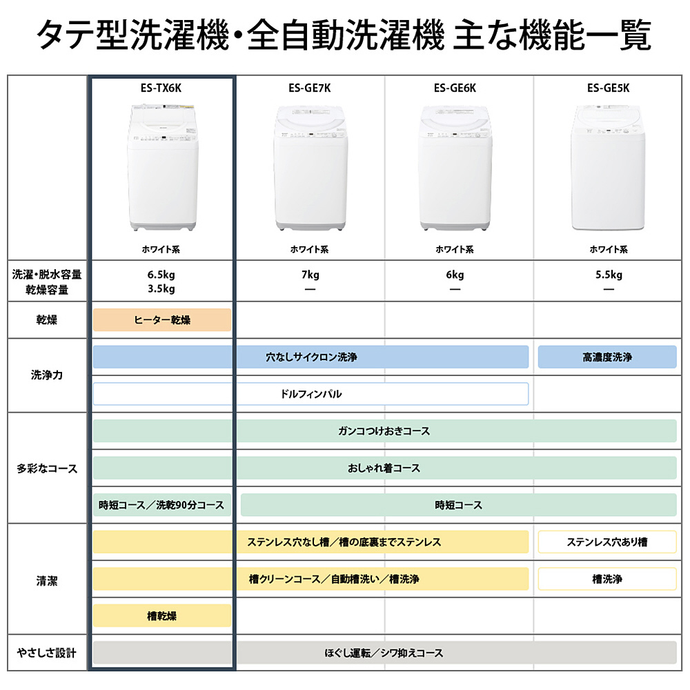 ES-TX6K-W 縦型洗濯乾燥機 ホワイト系[洗濯機6.5kg/乾燥3.5kg/ヒータ乾燥/上開き] ES-TX6K-W