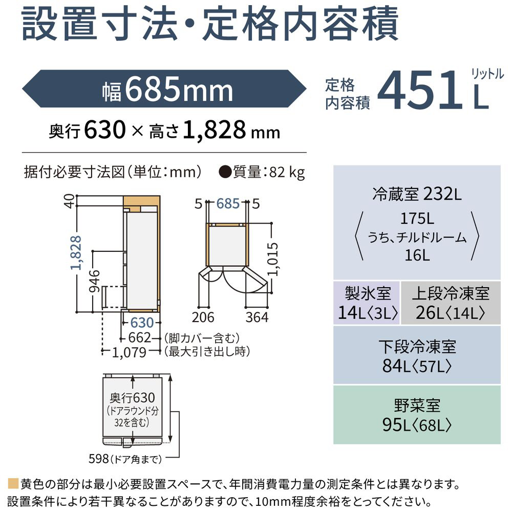 定格内容積451L〜500Lクラスで、業界トップクラスの奥行うす型63cm。