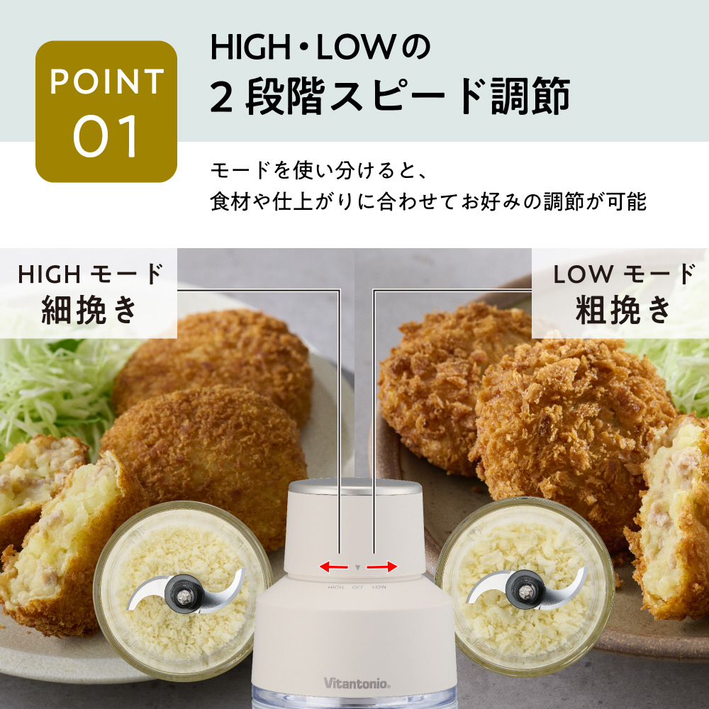 低速モードで柔らかい食材をお好みの大きさに仕上げる事ができます。