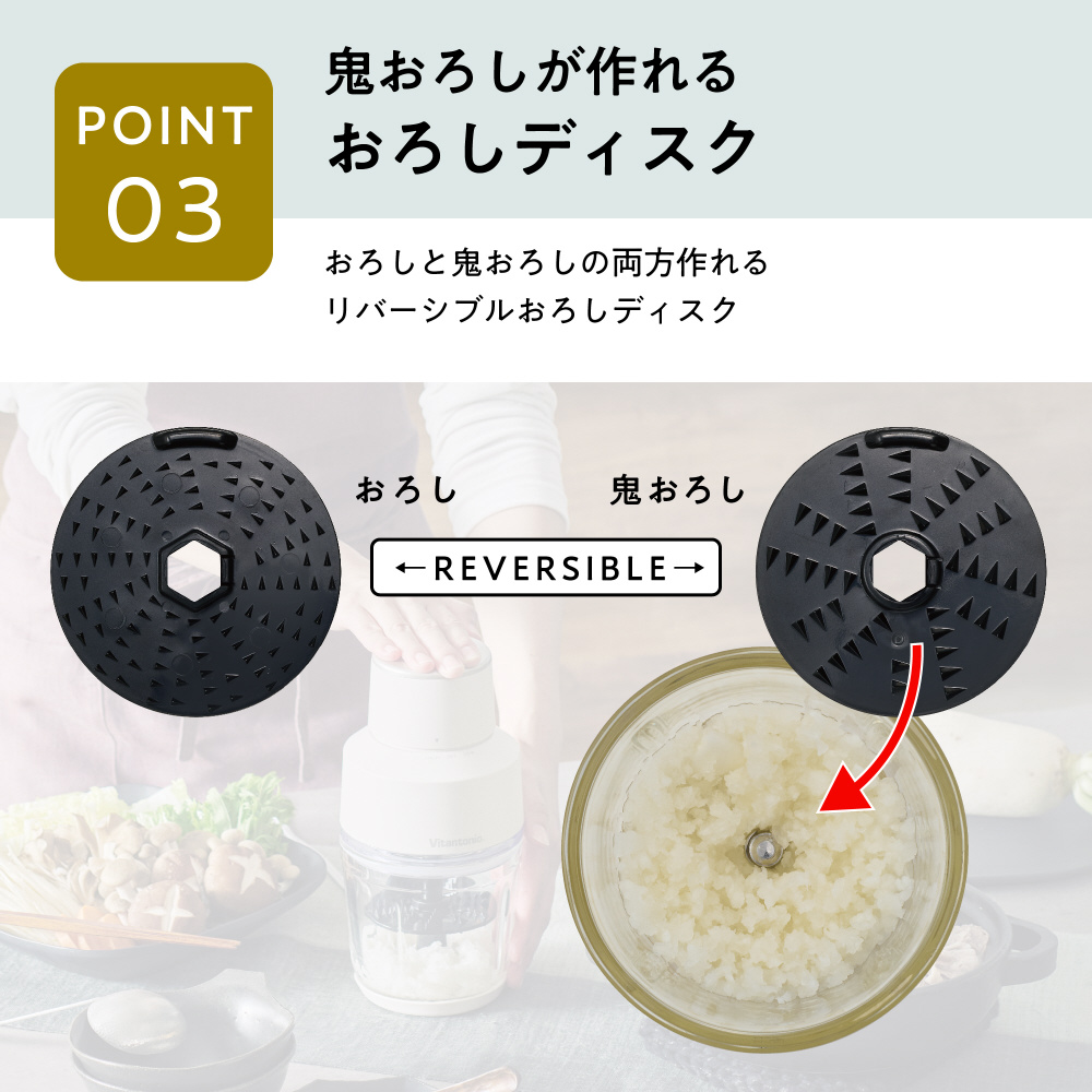 おろし円盤はリバーシブルで通常おろしと、みぞれ鍋に最適な食感が楽しめる鬼おろしができます。