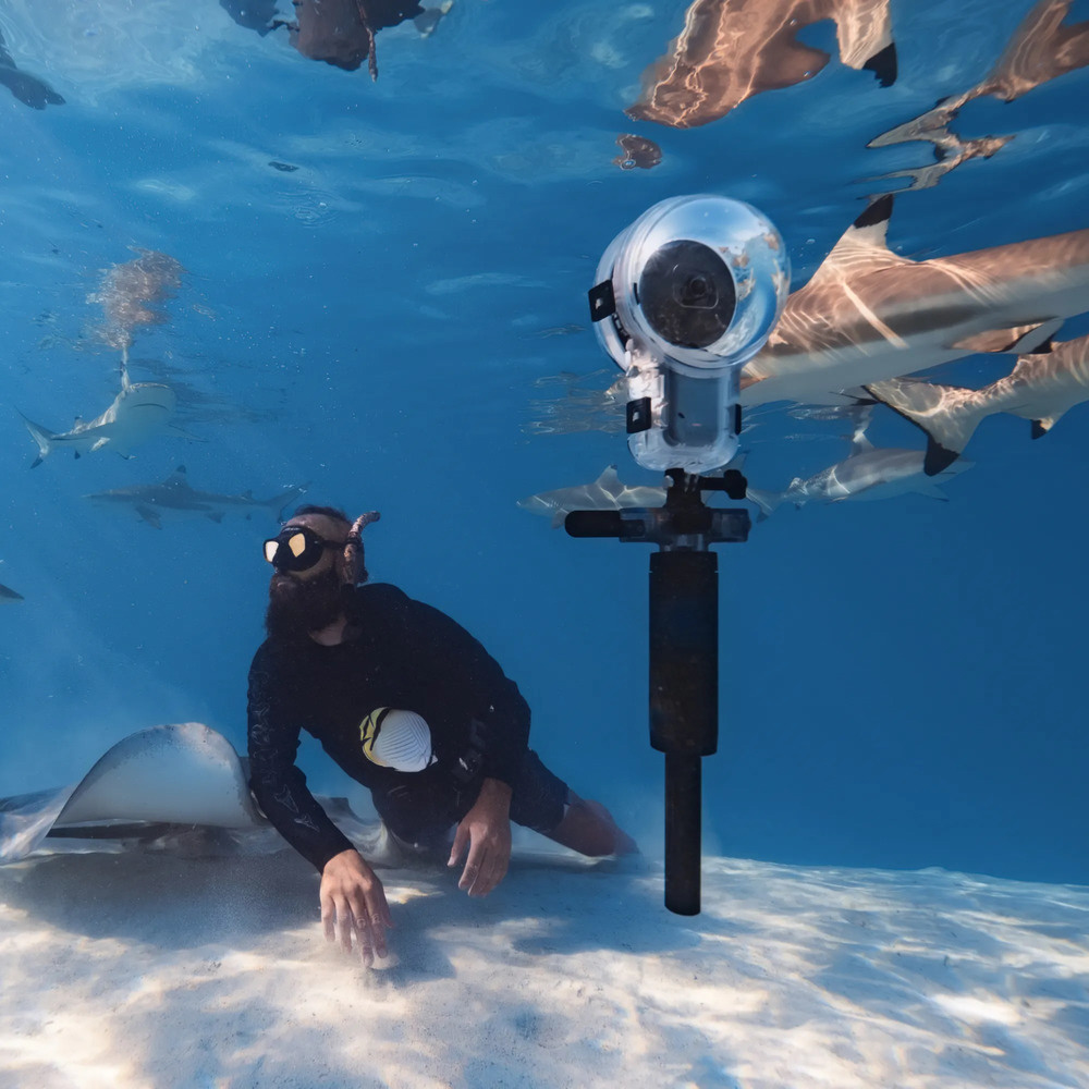 カメラマン不要。手元にカメラがなくても、このアクセサリーを360度全景カメラと組み合わせるだけで、水中でホバリングするような撮影アングルを実現できます。