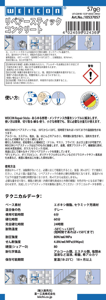 皮膚に刺激を与えたり、アレルギー性皮膚反応を引き起こす可能性があります。保護手袋を着用してください。皮膚の付着した場合は多量の水で充分に洗い流してください。眼に入ると大変危険で重篤な症状を引き起こす可能性があります。眼、顔面用の保護具を着用してください。水生生物に非常に強い毒性があり、長期継続的影響により有害物質となりますので、環境への放出は避けてください。粉塵を吸入しないようにし、取扱い後はよく洗ってください。衣服に付着した時は汚染された衣類を脱ぎ、再使用する前に洗濯してください。成分につきましてはSDSをご参照ください。表面をきれいにし、油分も取り除き、必要なら滑 り止めして下さい。室温(約20℃)でご使用ください。これより高い温度では、リペアスティックの寿命と硬化時間が短くなります。室温が16℃以下の温度では硬化に時間がかかります。5℃以下では硬化が止まります。