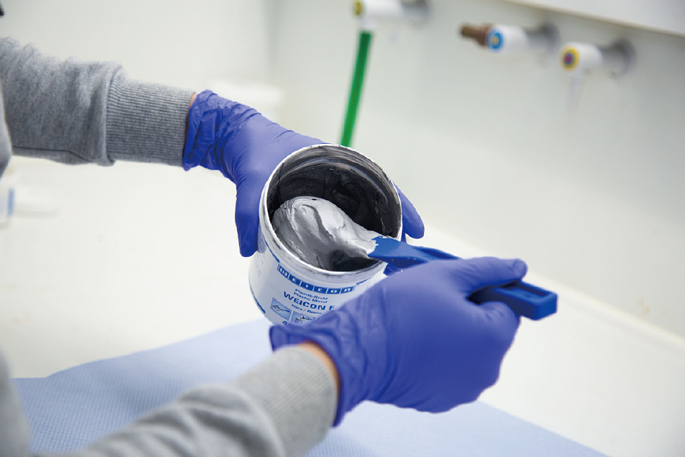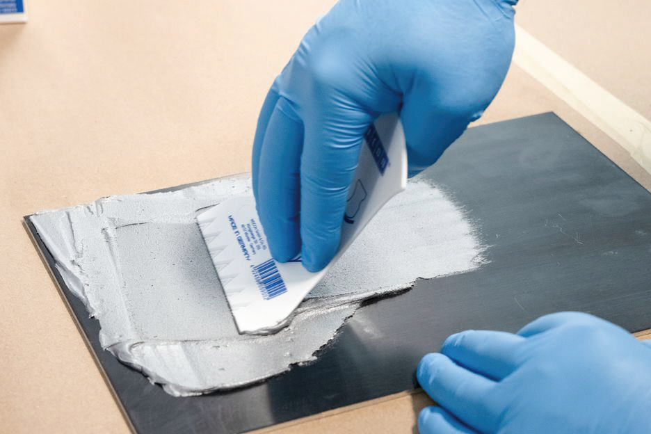 本製品を使用前に塗布する表面の脱脂や埃、錆、汚れを落としてください。平滑な面や特に汚れのひどい表面はさらに研磨工具を使用して表面前処理を行うことを推奨します。気泡なく均一に塗布されていることを確認してください。可使時間が60分の為、60分以内に処理できる量のバッチをご用意ください。薄いプレコートの場合 WEICON Fを十字に集中的に塗布してください。ひび割れのギャップ、荒い表面へよく浸透させることが出来ます。