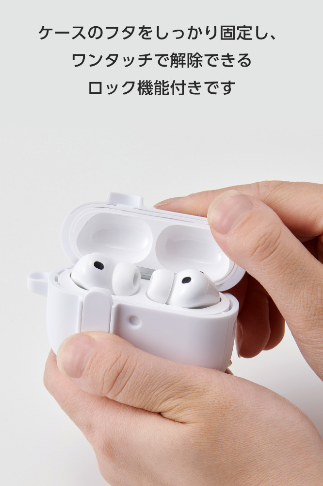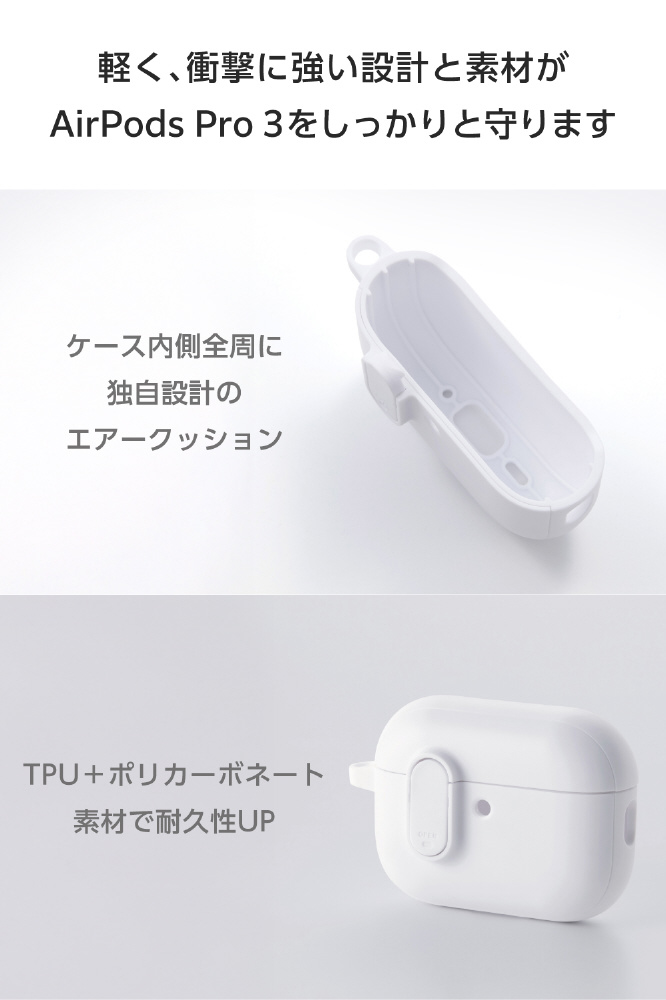 落下時の飛び出しを防ぐロック機能と、独自設計のエアークッションで守る、軽く、衝撃に強いAirPods Pro 3用TOUGH SLIM Lockハイブリッドケースです。