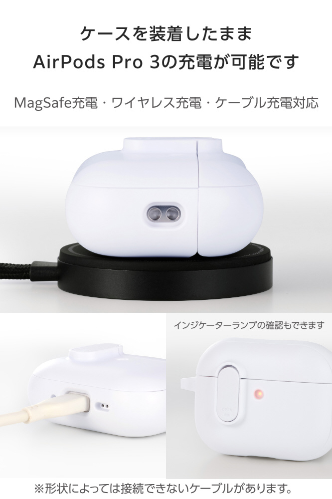 ケースを装着したまま、MagSafe充電器などのワイヤレス充電器、または純正ケーブルでの充電が可能です。