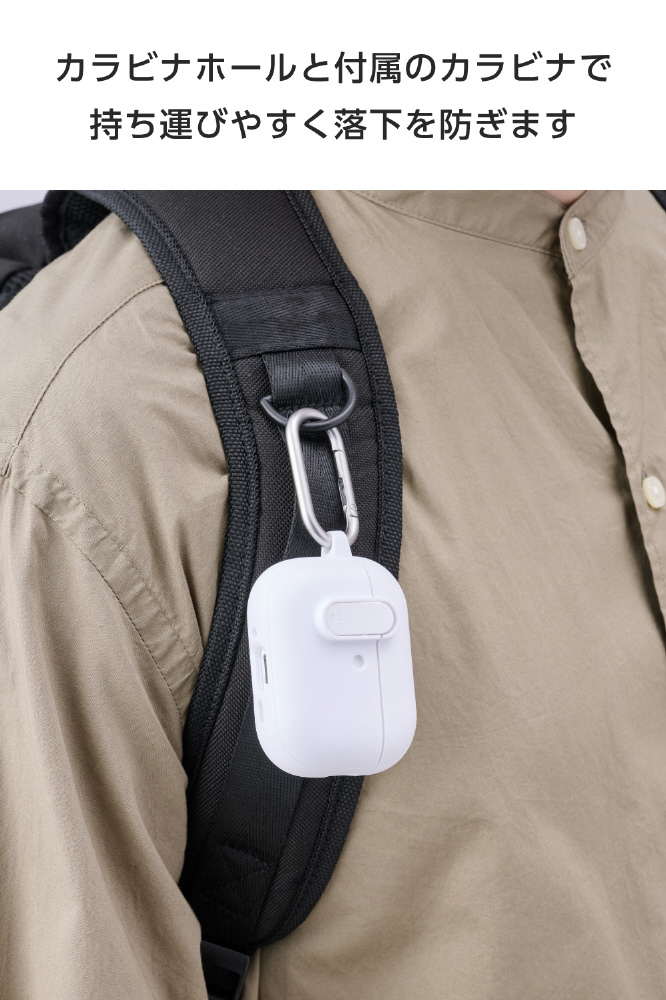 本体のカラビナホールに取り付け可能な、持ち運びやすく腰やかばんに装着できるカラビナが付属しています。