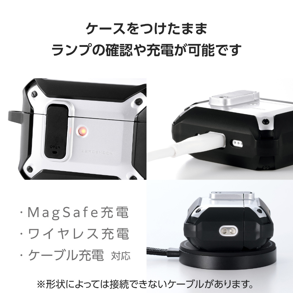 落下時の飛び出しを防ぐロック機能と、3つの衝撃吸収構造で衝撃から守るAirPods Pro 3用ZEROSHOCK Lockハイブリッドケースです。