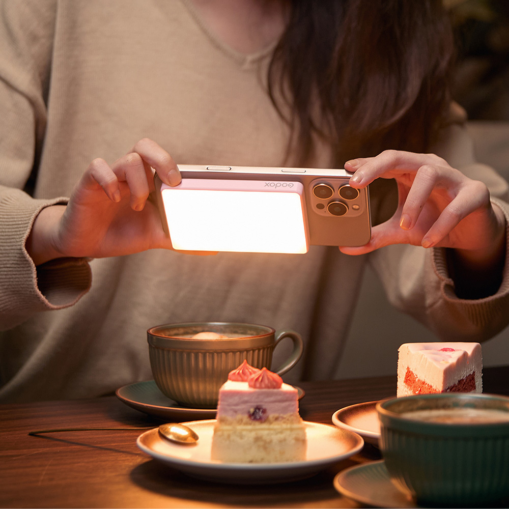 磁気アタッチメントと同じ面にセルフィー用ライトが内蔵されていますので、磁気対応のスマートフォンに取り付けた状態でカメラを起動すれば、簡単に上質なセルフィーを撮ることができます。