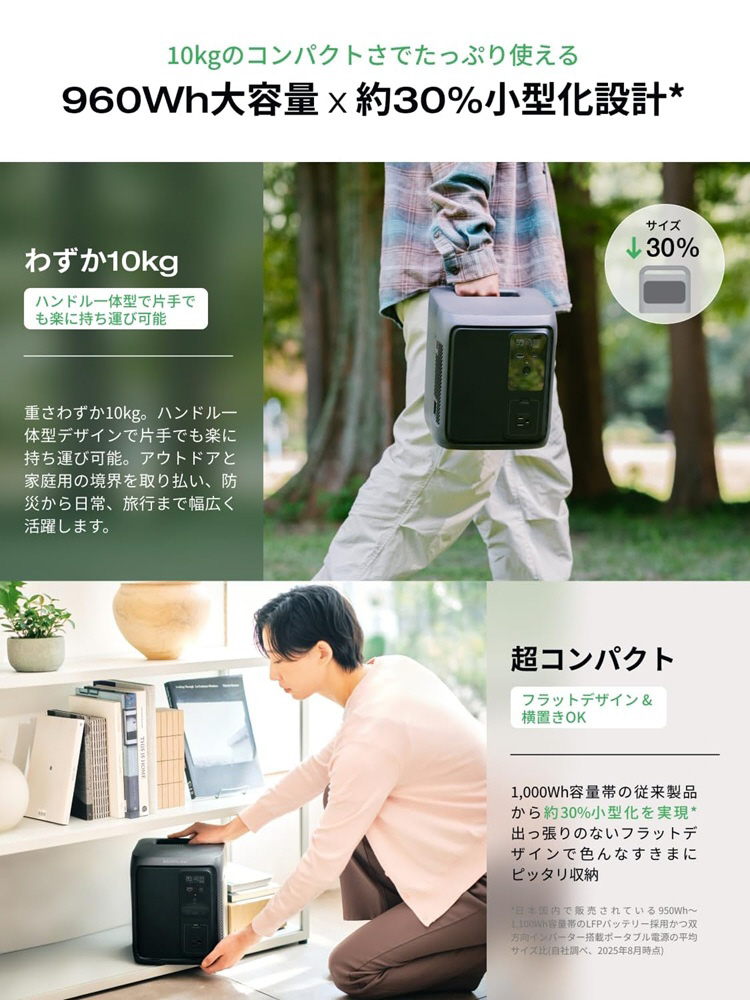 1,000Whクラスの従来製品から約30%小型化※2。960Whの大容量を備えつつ重量も約10kgと軽量で、一体型ハンドルにより簡単に持ち運べます。
