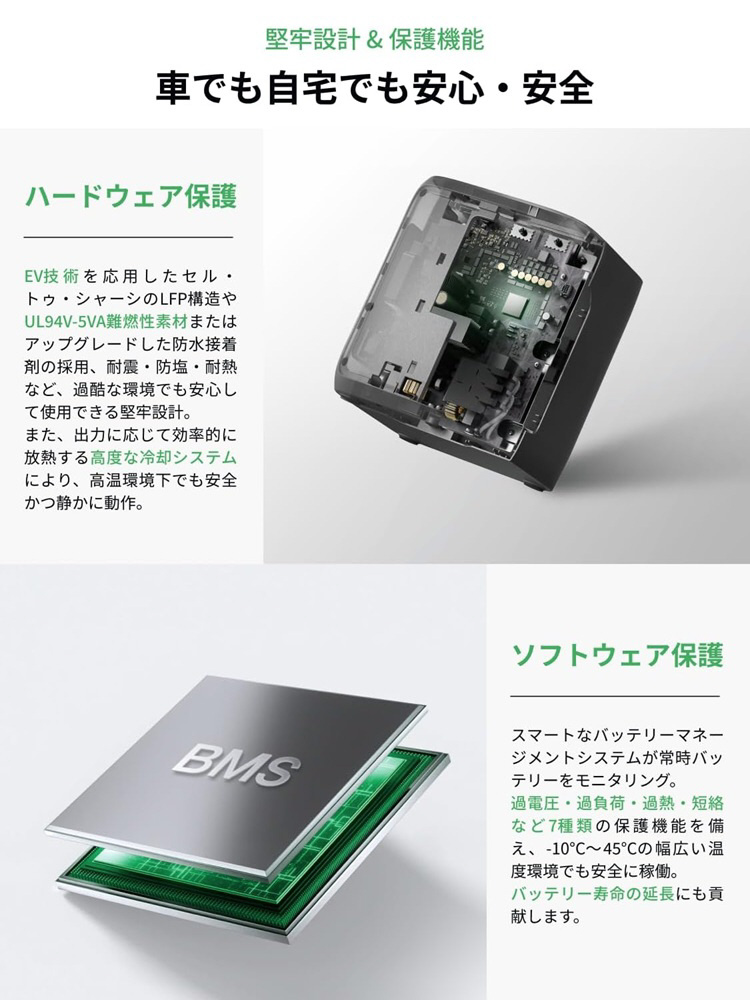 EV技術を応用した本体構造、難燃性素材の採用、防湿・防腐・防塩・防塵など、過酷な環境でも安心して使用できる堅牢設計。保護機能も豊富に搭載しています。