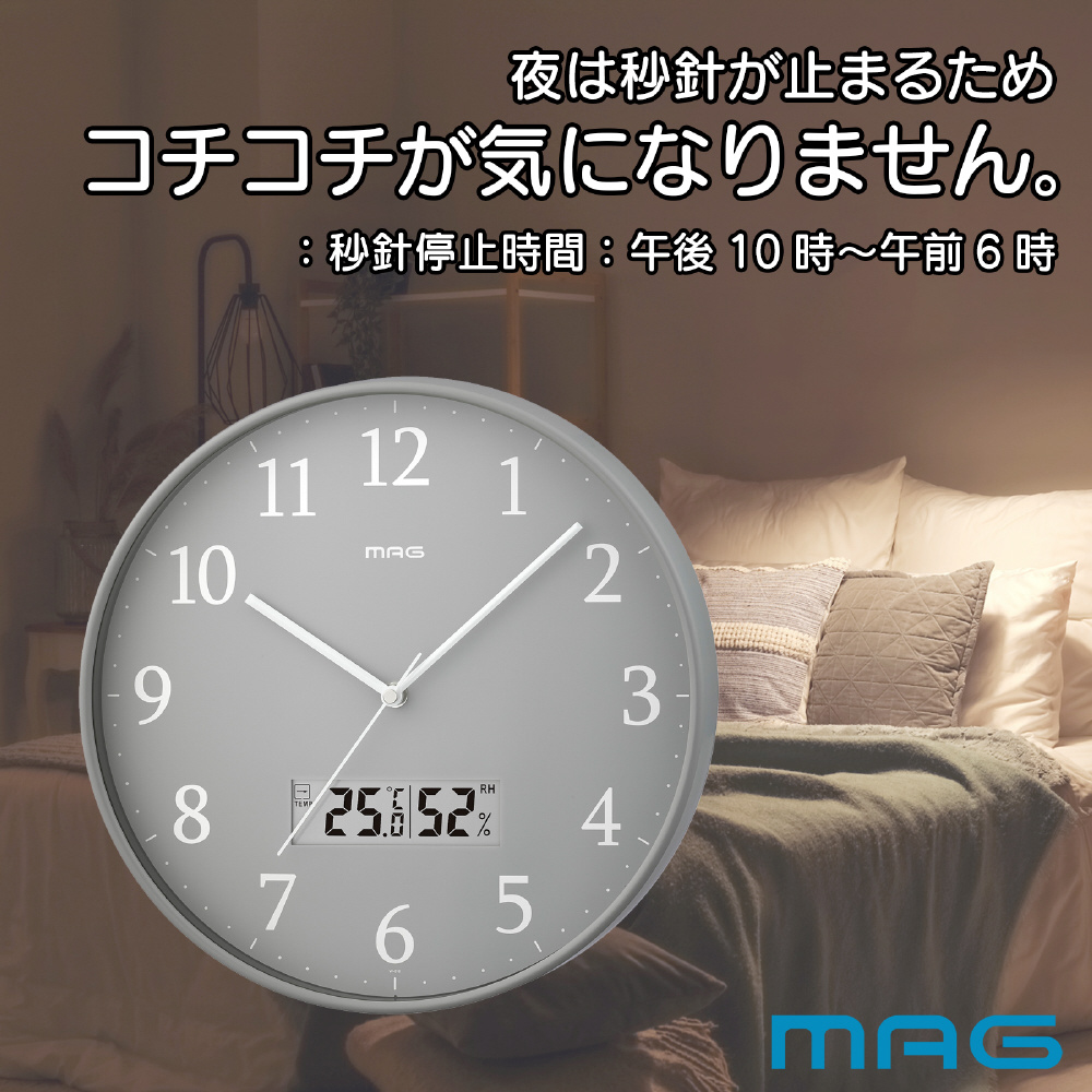 コチコチと1秒ごとに時を刻みますが、夜の10時から朝の6時までは秒針がストップします。