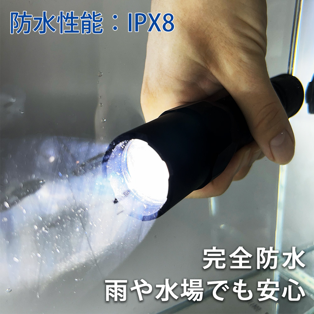 防水規格IPX8の完全防水仕様。水に落としても、光り続けます。
