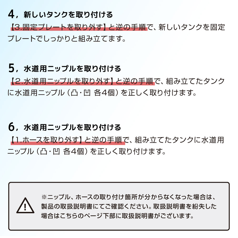 仕様2 注意事項:※必ず4本すべてのタンクを同時に交換してください。 一部のみ交換すると、性能低下の原因となります。 以下の工具をご用意いただくと交換作業をスムーズに行えます。 ●水道用ニップル用:17mmの平型レンチ ●蝶ナット・ボルト用:14mmの平型レンチ ※水道用ニップルを取り外す際に、内部のゴムパッキンが外れる場合があります。紛失や取り付け忘れにご注意ください。