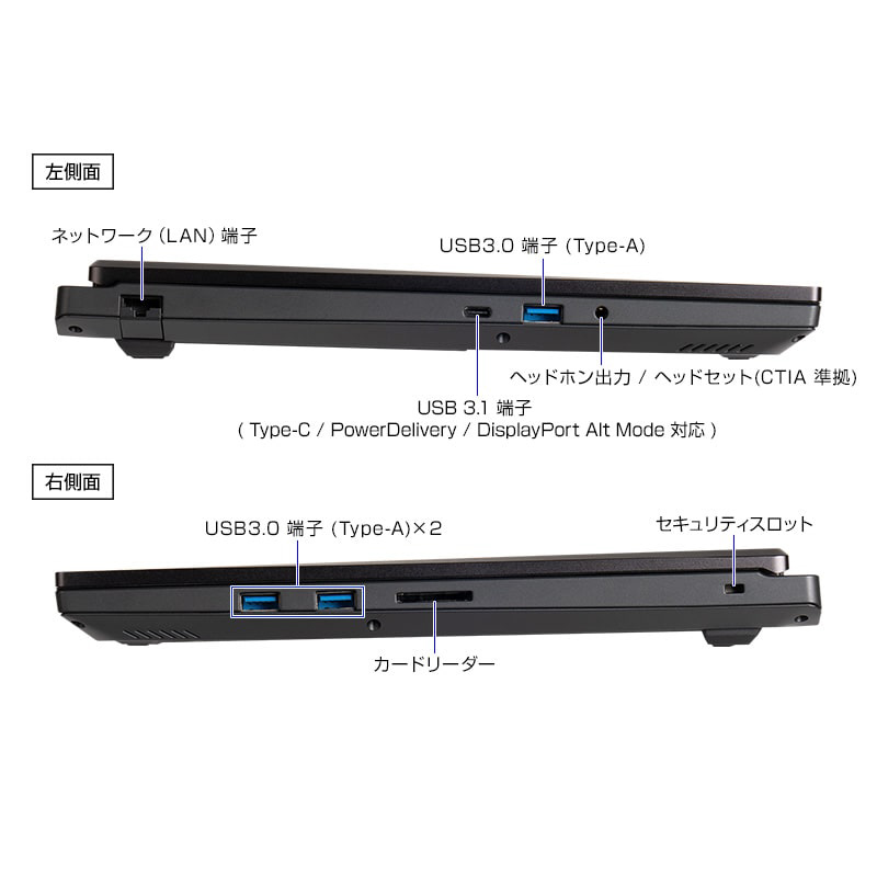 USB Type-A(右側面:USB 3.2 Gen 1(5Gbps)×2、左側面:USB 3.2 Gen 1(5Gbps)×1)