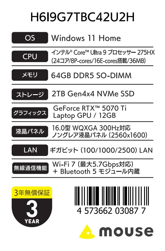 H6I9G7TBC42U2H ゲーミングノートパソコン G TUNE 16(RTX 5070 Ti) ブラック [16.0型 /Windows11 Home /intel Core Ultra 9 /メモリ:64GB /SSD:2TB /無し /日本語版キーボード]