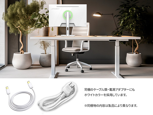 ■本体カラーにホワイトを採用。モニターベゼルも白となっており、爽やかでおしゃれな空間を演出したい場合や、デバイスを白で統一したい場合に最適です。さらに、付属の電源アダプター、ケーブル類にもホワイトカラーを採用。全体が白基調に統一された部屋や医療機関などでの使用にも最適です。