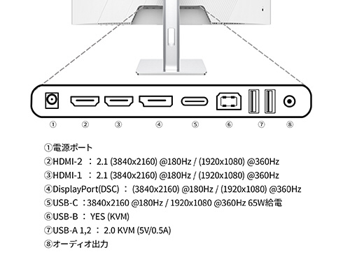 ■入力端子は、HDMI 2.1 x2 (4K:180Hz/フルHD:360Hz)、DisplayPort (DSC) x1 (4K:180Hz/フルHD:360Hz)とUSB-C x1 (4K:180Hz/フルHD:360Hz/最大65W給電)を装備し、様々な機器との接続が可能です。USB-C(最大65W給電)は、対応のPCであればUSB-Cケーブル1本でモニターへの映像出力とノートPCへの給電が可能。ケーブル1本でスッキリ接続出来るだけでなく、テレワーク、出社併用の場合などノートPCのACアダプターを持ち運ぶ必要が無くなります。