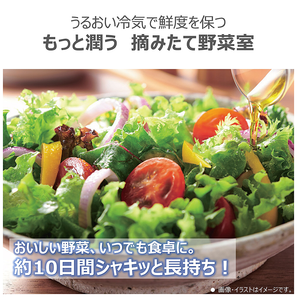 新鮮ツイン冷却システムにより湿度と温度を細かくコントロールする事で、より野菜に快適な環境を作りだして鮮度を約10日間キープ。さらに、野菜を入れておくだけで栄養素もアップ!収穫したてのようなみずみずしさとおいしさ・栄養をしっかり守り、まとめ買いにも安心。無駄なく野菜を使いきれます。
