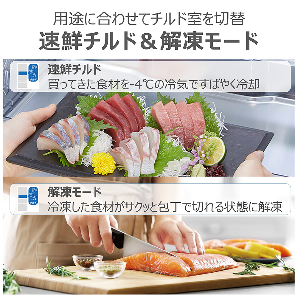 ■肉・魚などの鮮度とおいしさを長持ちさせる「速鮮チルド」「解凍モード」